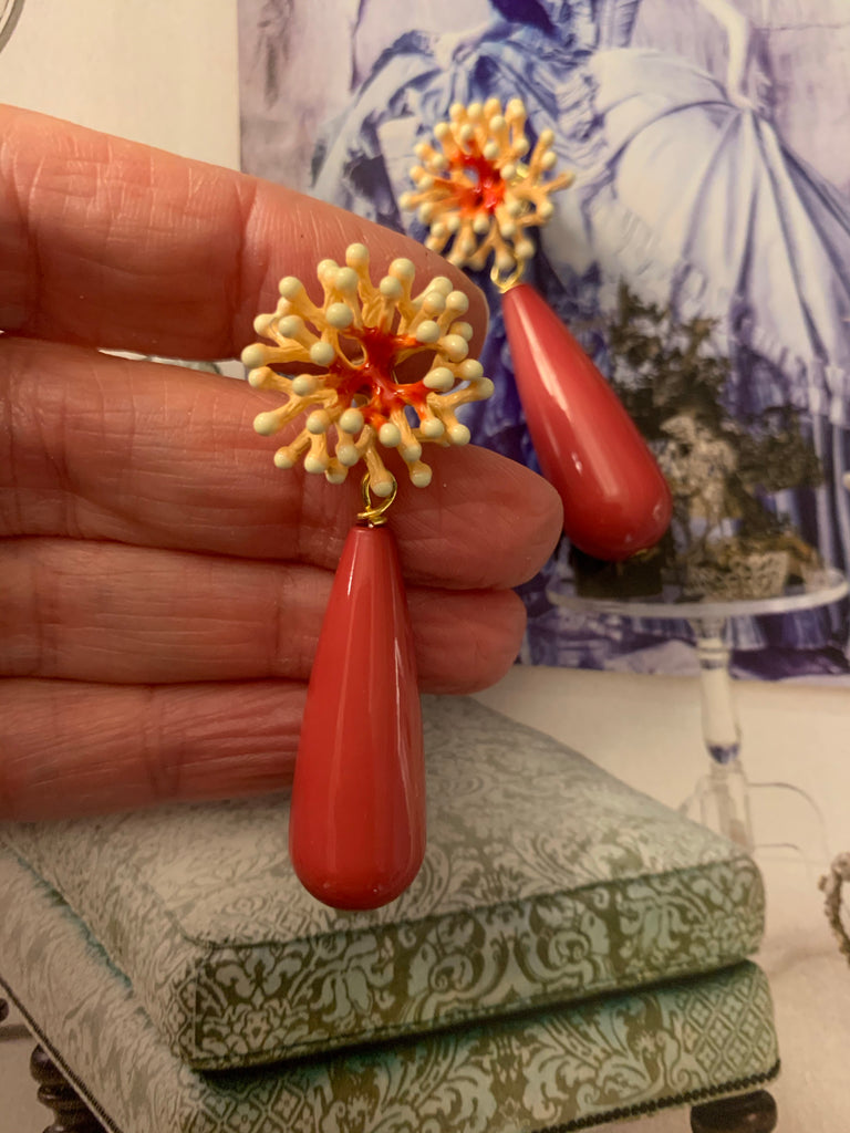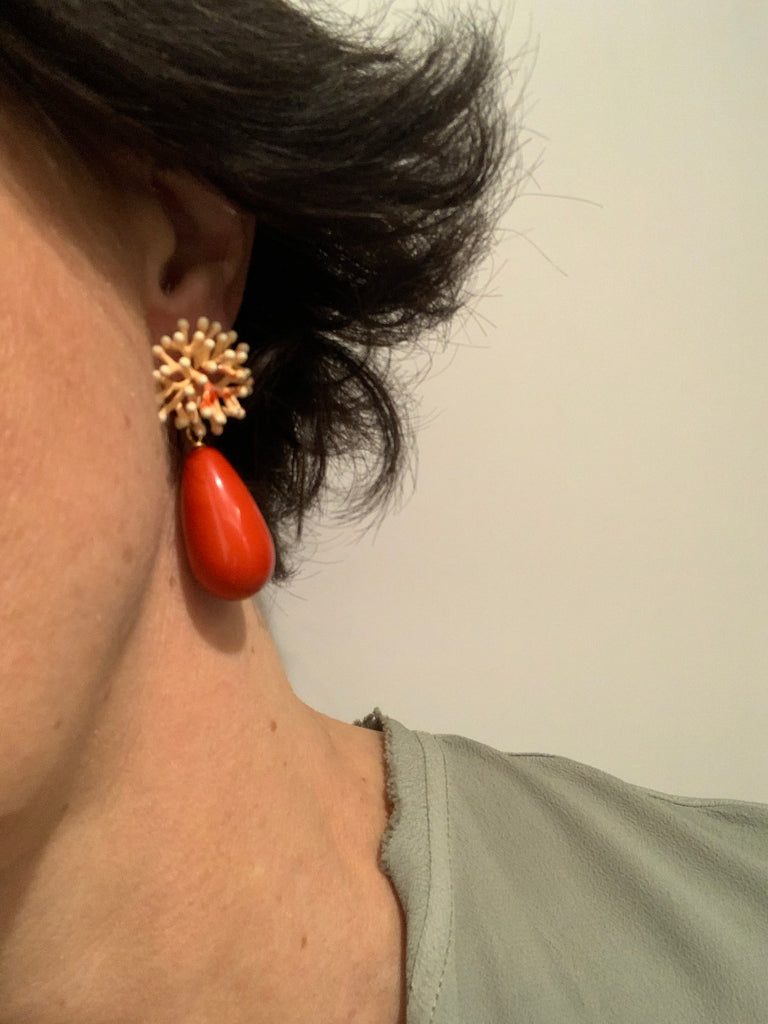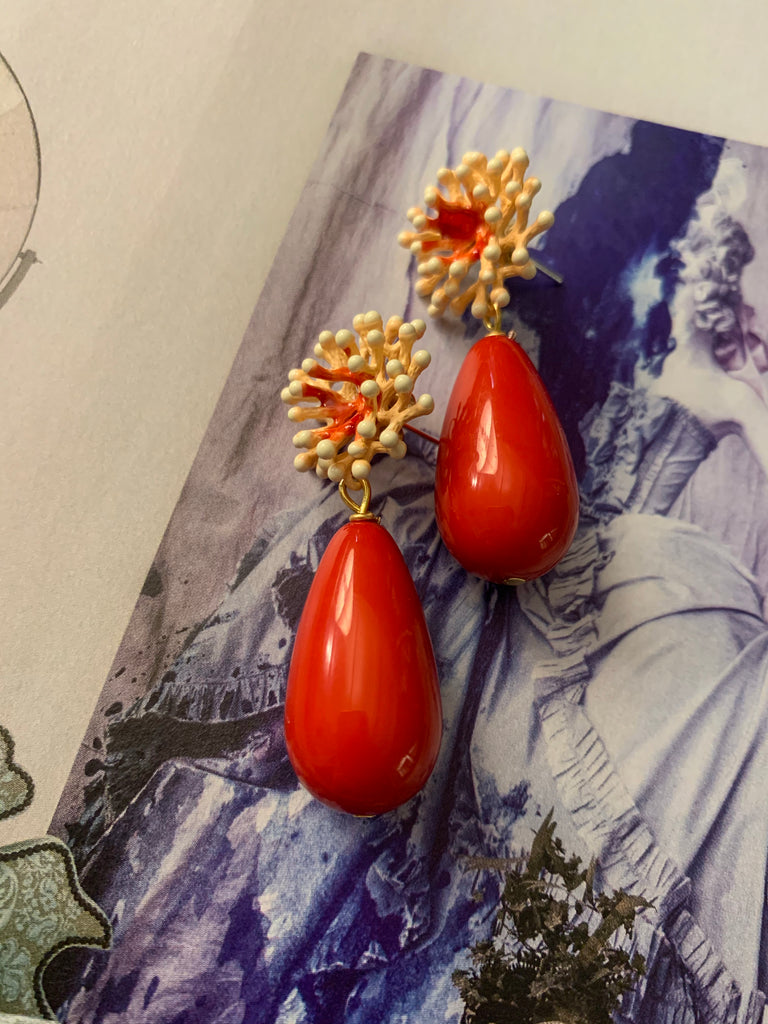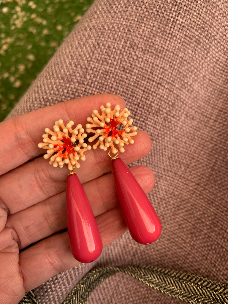 Coppia di orecchìni con monachella lavorata e smaltata, simile a un corallo, da cui pendono coloratissime gocce in resina leggera. Lunghezza totale circa 7 cm. Rigorosamente anallergici