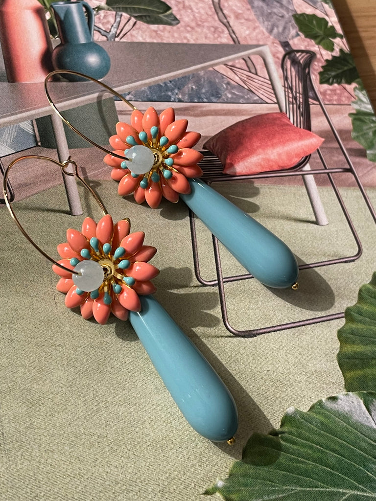 Orecchini pendenti che partono da un fiore tridimensionale con una doppia corolla di petali color salmone e una corolla centrale di pistilli azzurri. Pende una lunga goccia in resina celeste, che richiama la pietra centrale in agata azzurra. A lobo, due cerchi dorati. Gli orecchini misurano circa 8 cm di lunghezza e sono rigorosamente anallergici