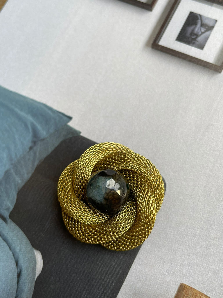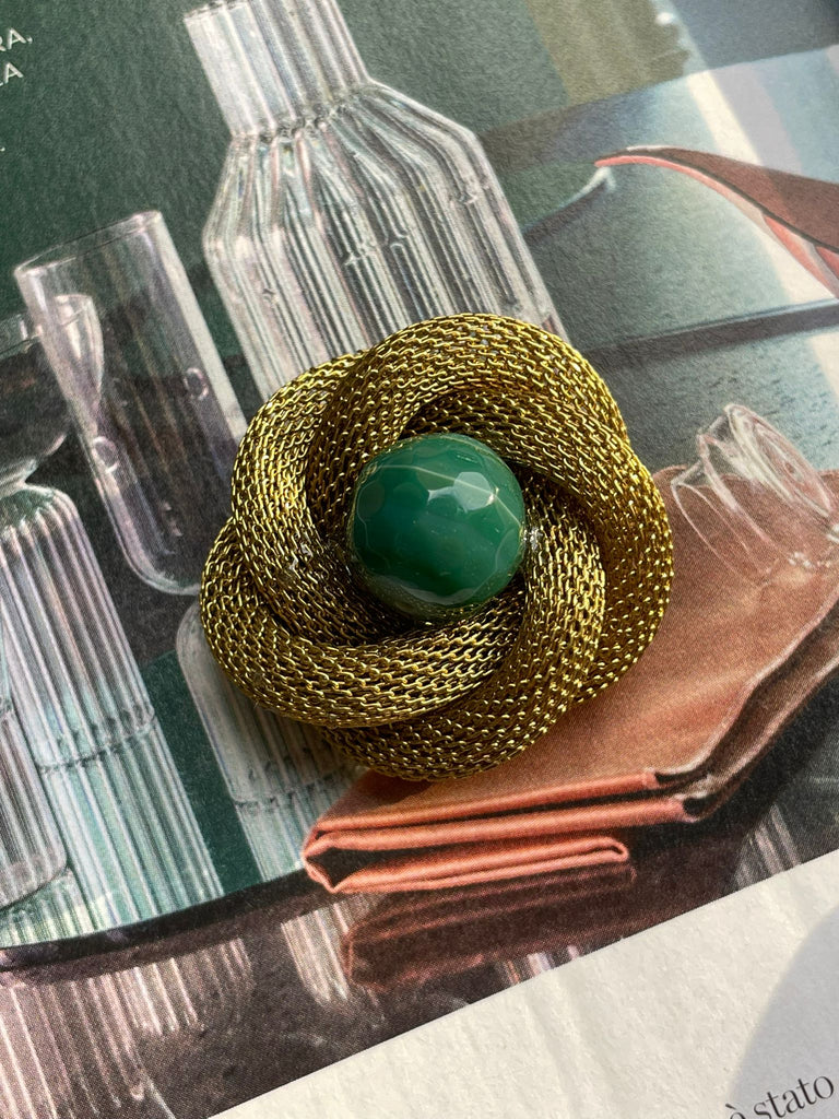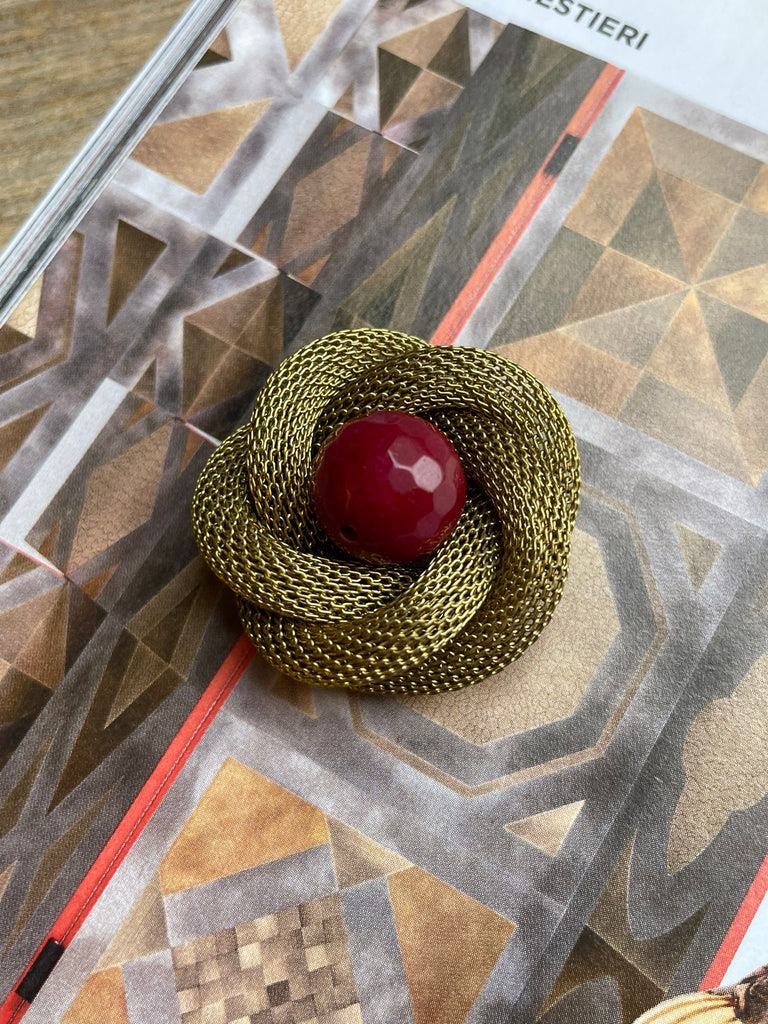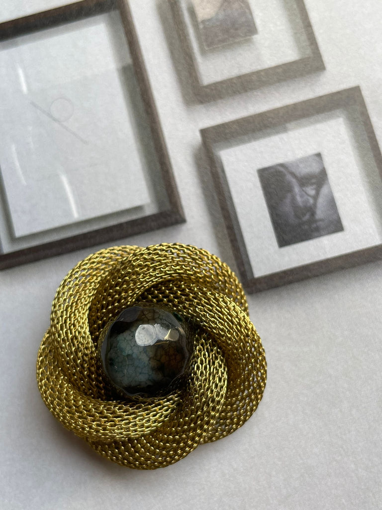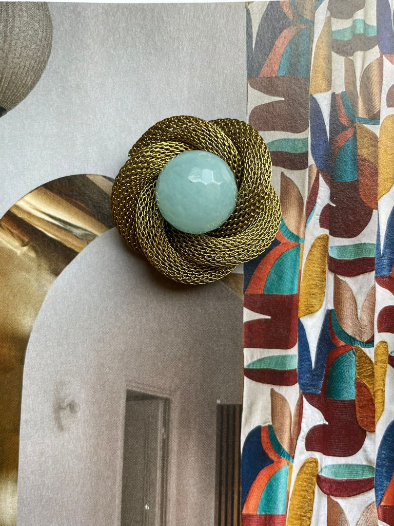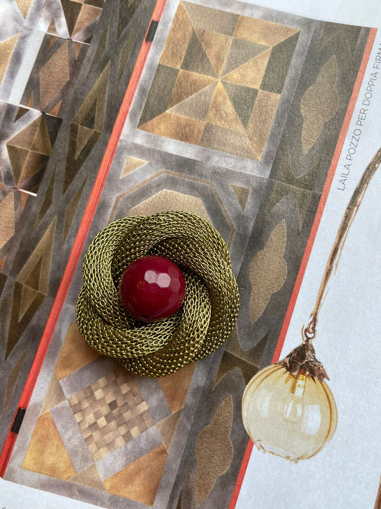 Un torchon di maglia metallica che si avvolge su se stesso come in una giostra di alti e bassi. Una pietra dura centrale, sfaccettata o no, che dia luminosità a un accessorio semplice. Con solo due componenti, questa spilla può diventare l’alleato migliore per i revers di una giacca o per il colletto di un cappotto. Diametro di circa 4 cm.