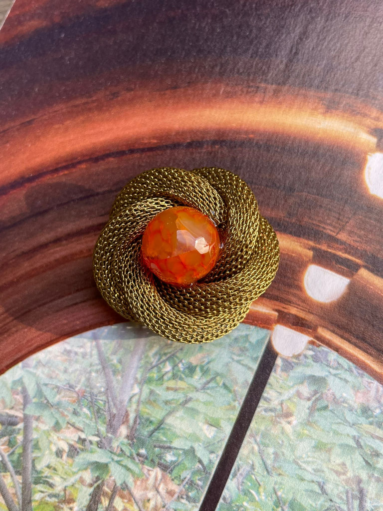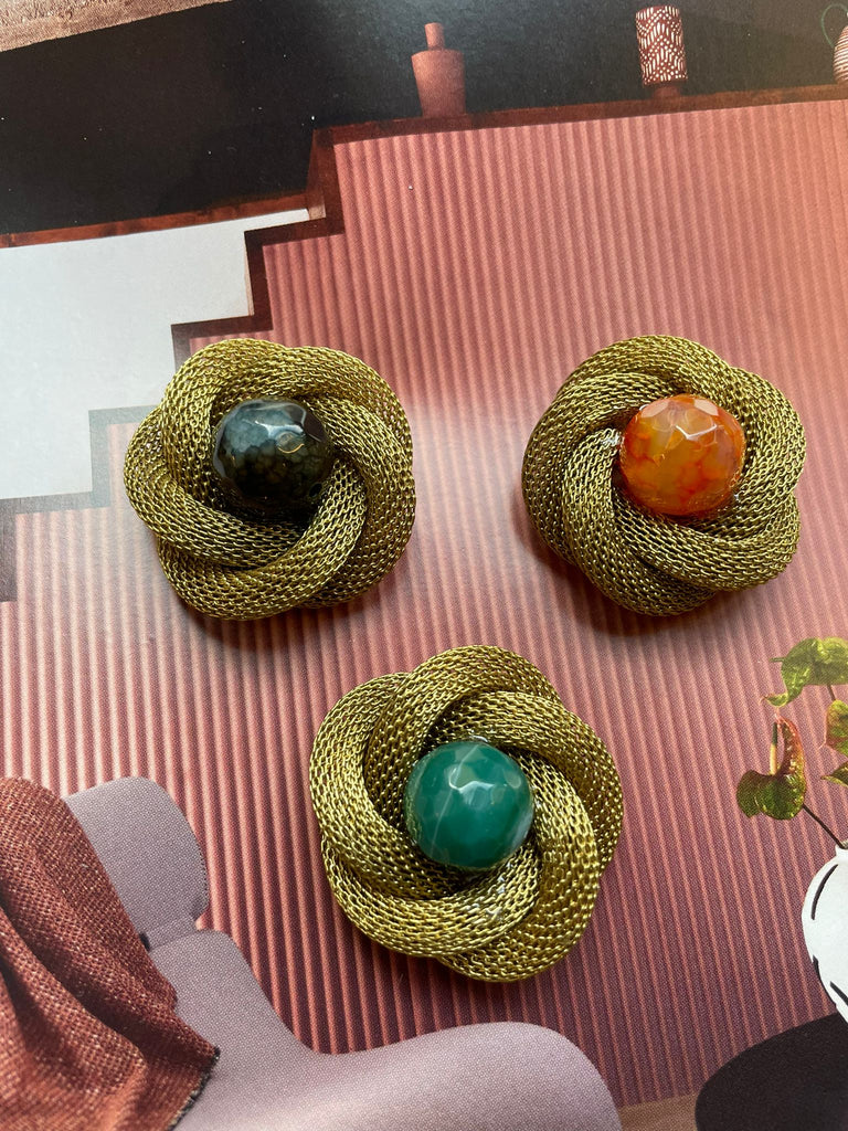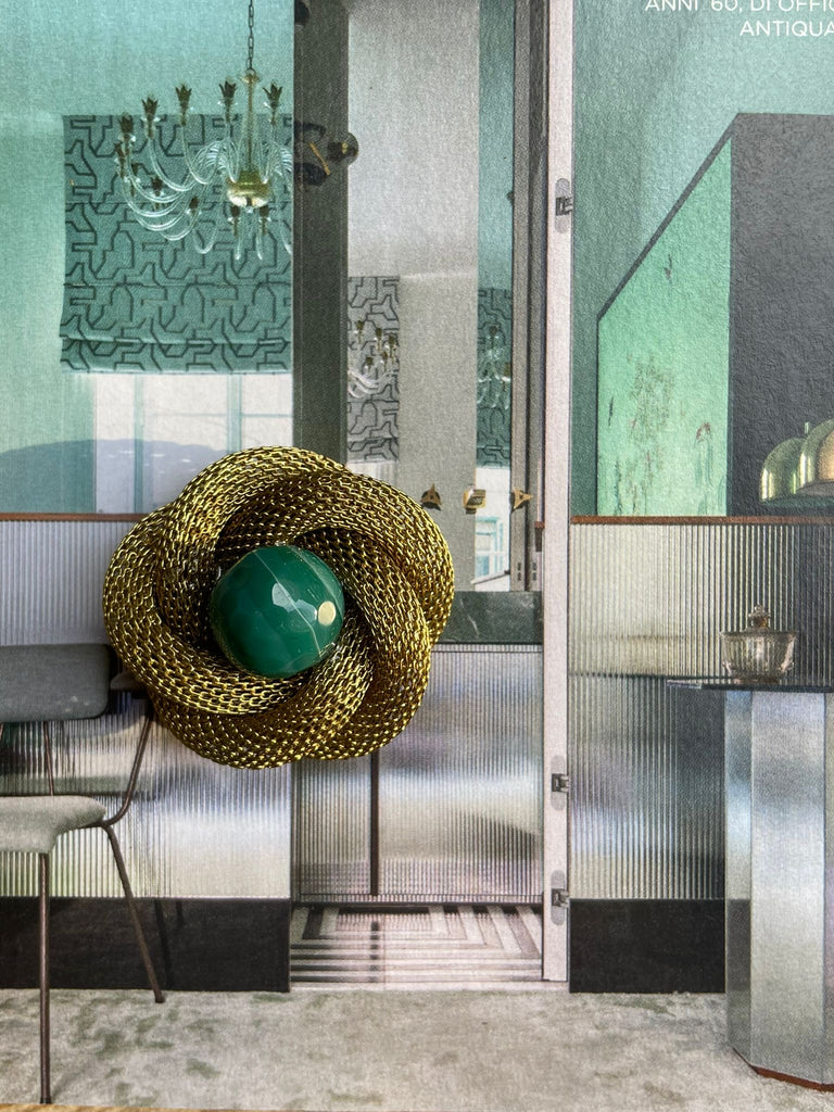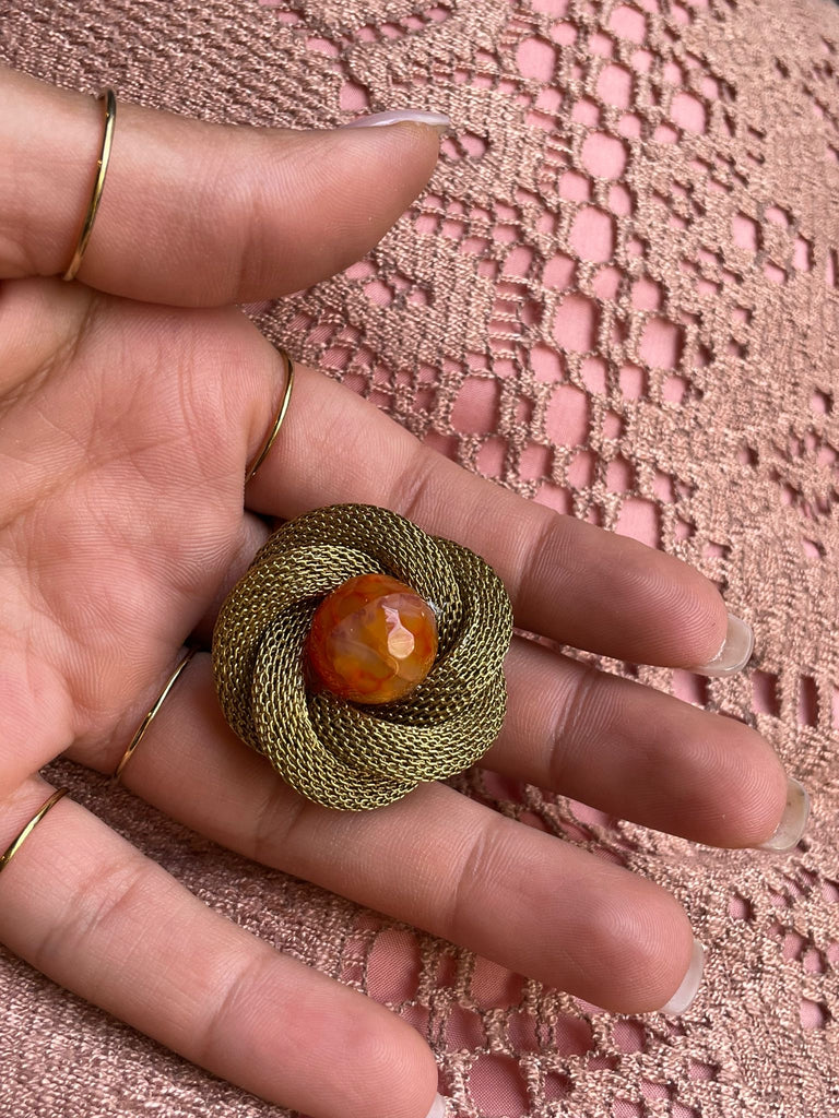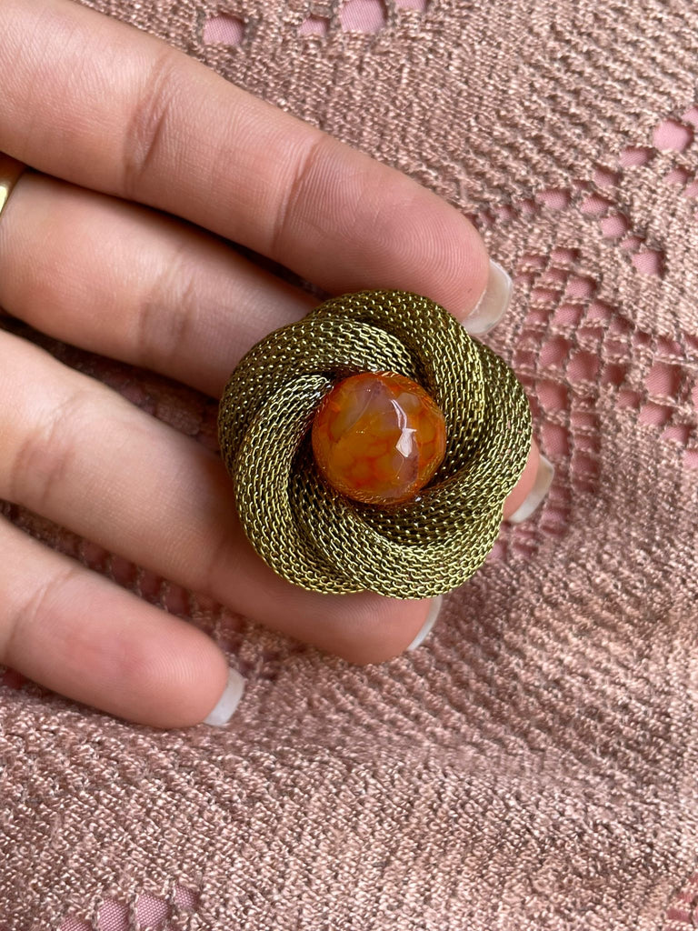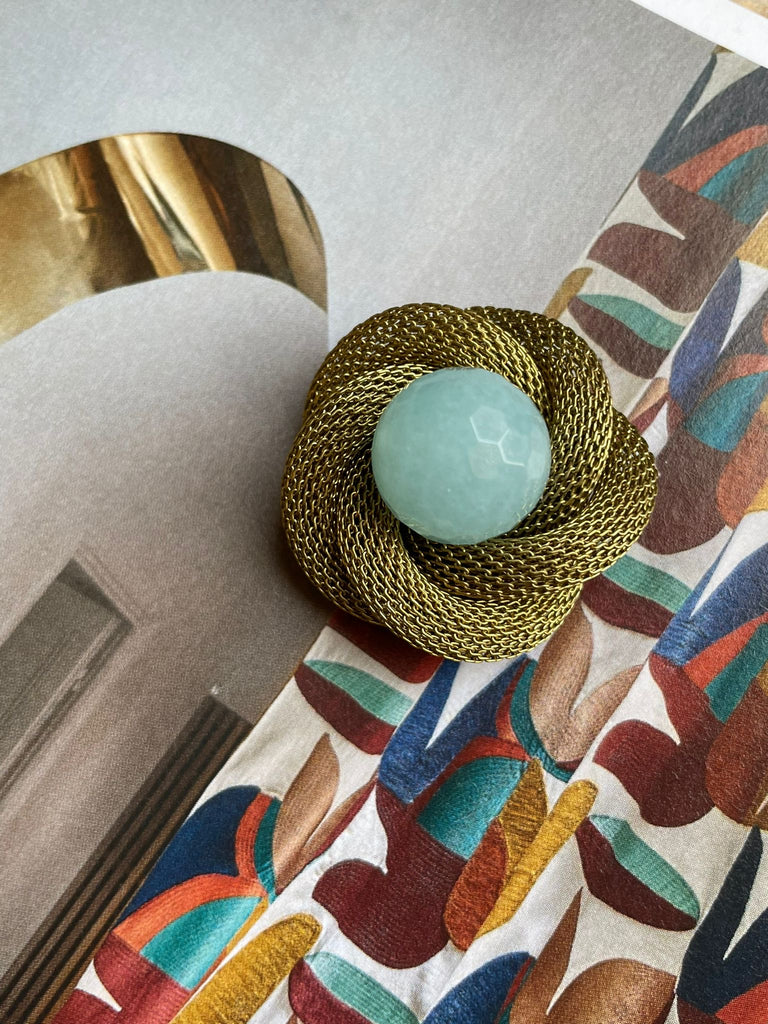 Un torchon di maglia metallica che si avvolge su se stesso come in una giostra di alti e bassi. Una pietra dura centrale, sfaccettata o no, che dia luminosità a un accessorio semplice. Con solo due componenti, questa spilla può diventare l’alleato migliore per i revers di una giacca o per il colletto di un cappotto. Diametro di circa 4 cm.