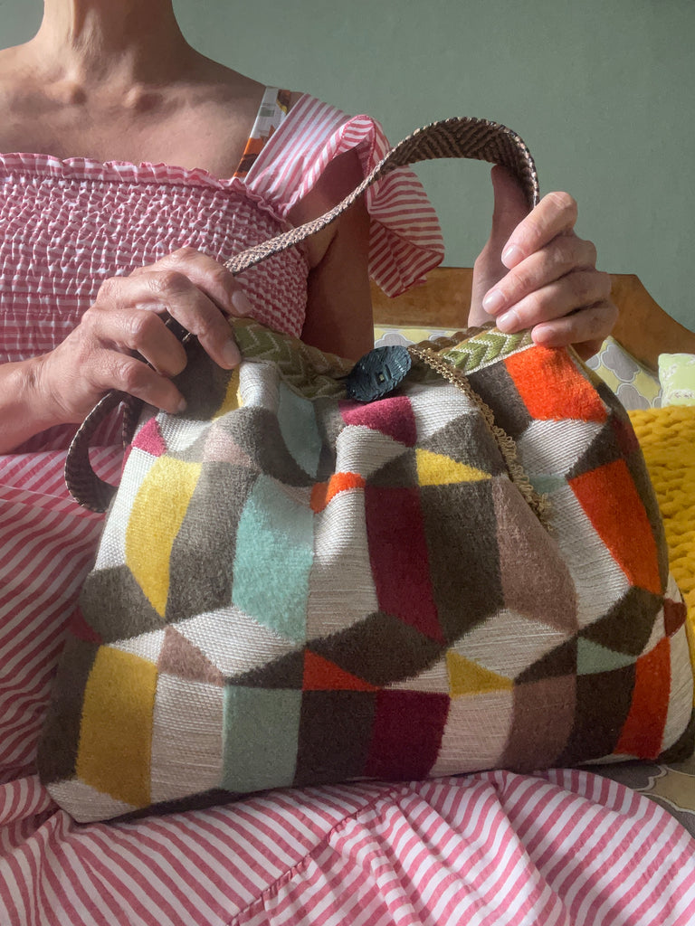 Borsa di grandi dimensioni, davvero capiente, cucita interamente a mano con tessuto da arredamento, doppiato, in modo da garantirne tenuta e consistenza. Il tessuto esterno è in velluto a disegni geometrici di molti colori. Il tessuto viene da Parigi e mi ha subito entusiasmato perché combina colori vivaci a texture invernali. La passamaneria al bordo superiore ha motivi geometrici verse salvia, giallo e sabbia, mentre il bottone di chiusura è un grande bottone gioiello verde scuro il manico è in corda piatta la borsa misura 39 cm di larghezza per 28 di altezza .