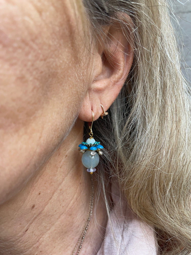 Orecchini corti e leggeri, seppur leggermente pendenti. Sono composti da una pallina in resina colorata del diametro di circa 1,2 cm nella parte sotto, a cui si aggiunge un fiore grande in metallo smaltato, tridimensionale e lavorato a mano e una seconda pallina in resina, più piccola, nella parte alta. Il fiore smaltato viene lavorato e modellato con le mani in modo da risultare aperto e ampio. Gli orecchini misurano circa 4 cm e sono rigorosamente anallergici e, naturalmente, leggerissimi.
